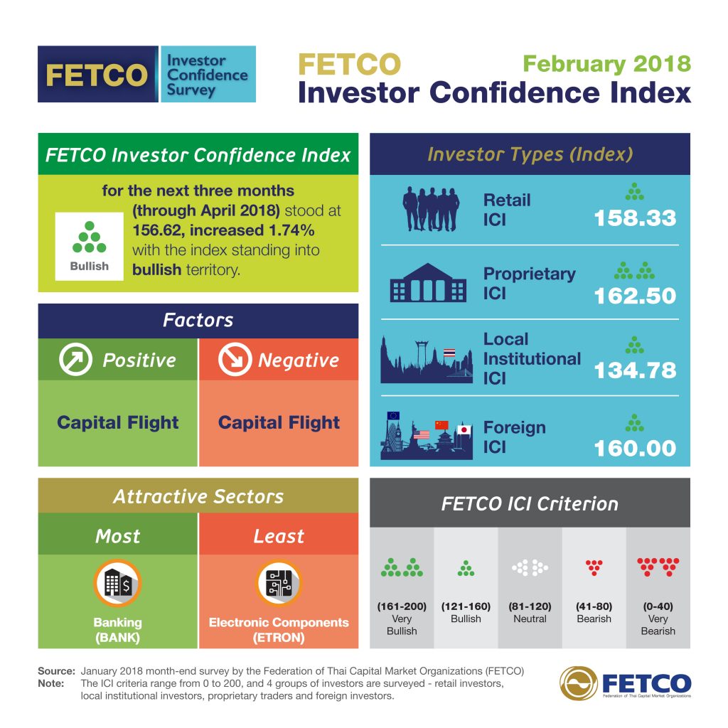 Dr. Santi Kiranand, representative of the Federation of Thai Capital Market Organizations (FETCO), commented on the monthly FETCO Investor Confidence Index (ICI) for February 2018 details follow:
