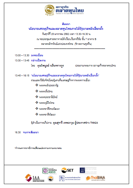 กำหนดการ Published 18/12/18 at 442 × 625 in สัมมนา “นโยบายเศรษฐกิจและตลาดทุนไทยภายใต้รัฐบาลหลังเลือกตั้ง” Next →