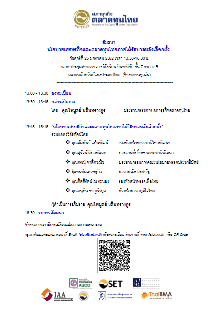 กำหนดการ Published 10/01/19 at 442 × 629 in สัมมนา “นโยบายเศรษฐกิจและตลาดทุนไทยภายใต้รัฐบาลหลังเลือกตั้ง” ← Previous Next →