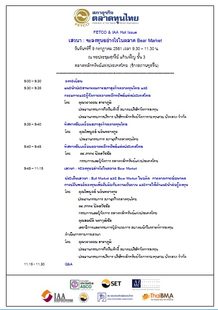 กำหนดการ Published 22/06/18 at 439 × 625 in เสวนาหัวข้อ “จะลงทุนอย่างไรในตลาด Bear Market” ในวันจันทร์ที่ 9 กรกฎาคม 2561 เวลา 9.00 – 11.30 น ← Previous Next →