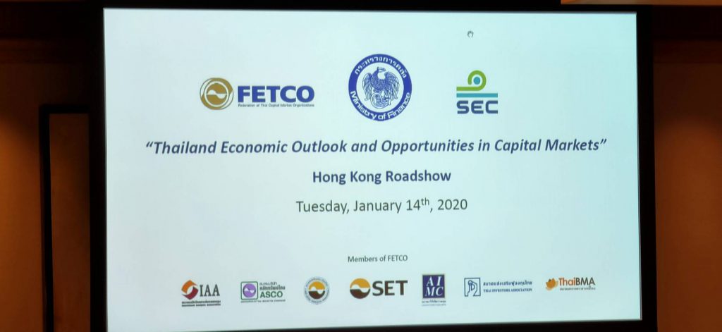 สภาธุรกิจตลาดทุนไทยร่วมกับกระทรวงการคลัง สำนักงานคณะกรรมการกำกับหลักทรัพย์และตลาดหลักทรัพย์ ตลาดหลักทรัพย์แห่งประเทศไทย จัดประชุม Hong Kong Roadshow “Thailand Economic Outlook and Opportunities in Capital Markets” ให้แก่นักลงทุนสถาบันต่างประเทศเข้าร่วมงานกว่า 35 รายเข้าร่วมการประชุมในวันอังคารที่ 14 มกราคม 2563 ณ โรงแรมแกรนด์ไฮแอท ฮ่องกง เขตบริหารพิเศษฮ่องกงแห่งสาธารณรัฐประชาชนจีน