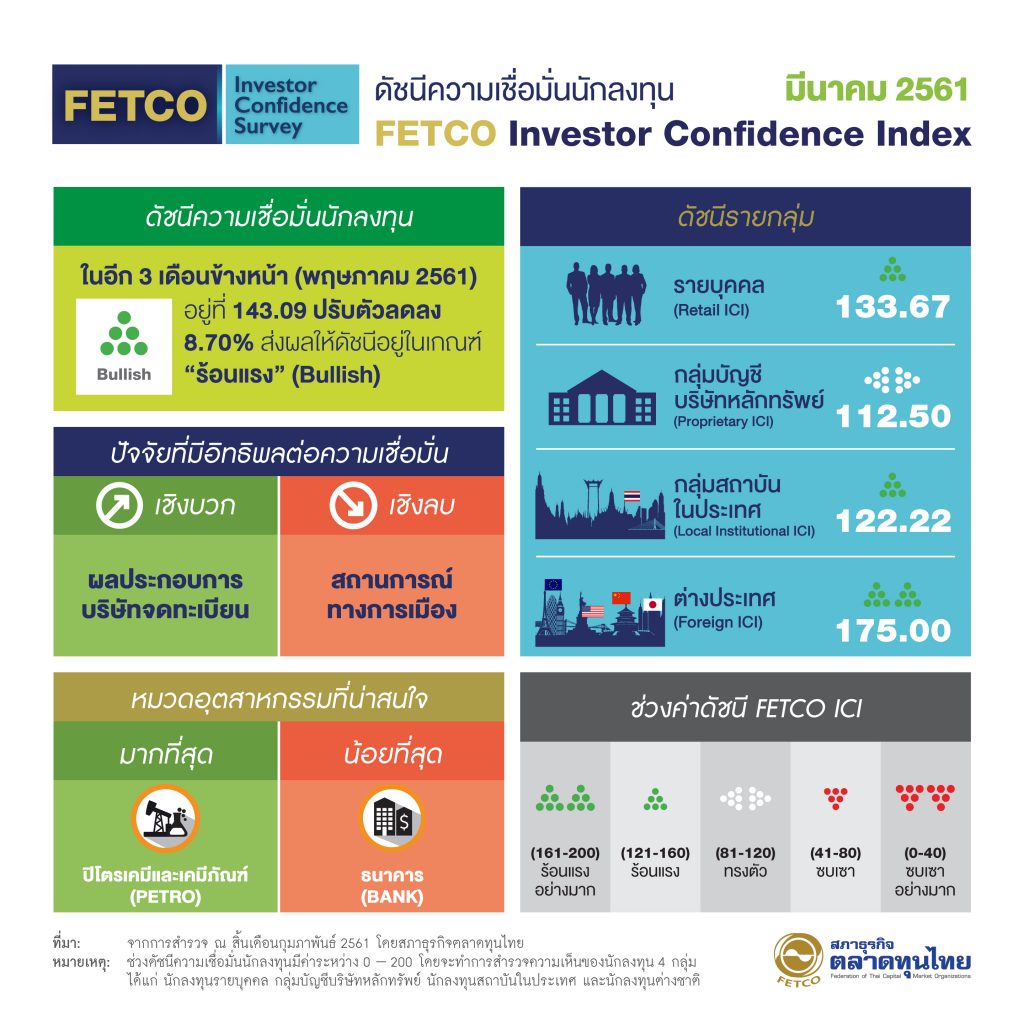 นายกีรติ โกสีย์เจริญ ผู้แทนสภาธุรกิจตลาดทุนไทย เปิดเผยดัชนีความเชื่อมั่นนักลงทุน (FETCO Investor Confidence Index) ประจำเดือนมีนาคม 2561